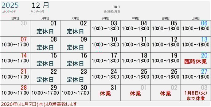 12月、1月共に月曜・火曜は定休日となりますのでお間違えの無いようお気をつけください。